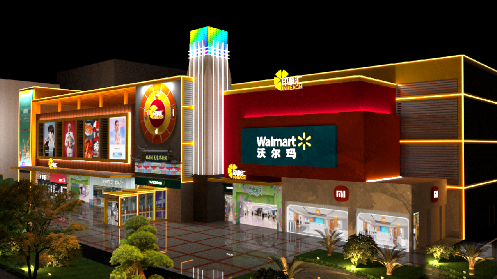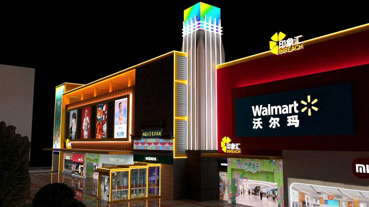 在具體方案中,設(shè)計團(tuán)隊采用 "分層布光、主次呼應(yīng)" 的策略:建筑主立面以 3000K 暖白光洗墻燈為基礎(chǔ),通過精準(zhǔn)的光束角控制,勾勒出簡潔大氣的建筑輪廓,既凸顯了現(xiàn)代商業(yè)建筑的利落線條,又與沃爾瑪超市的溫馨消費(fèi)氛圍相適配;裙樓部分則創(chuàng)新采用暗藏式 LED 線條燈,沿商鋪招牌的邊緣有序排布,在夜間形成連貫的光影燈帶,既保證了商鋪標(biāo)識的清晰呈現(xiàn),又避免了強(qiáng)光對行人的視覺干擾。這種設(shè)計既尊重了建筑原有結(jié)構(gòu),又通過燈光層次的變化,讓建筑在夜色中呈現(xiàn)出 "遠(yuǎn)觀有輪廓,近賞有細(xì)節(jié)" 的視覺效果。