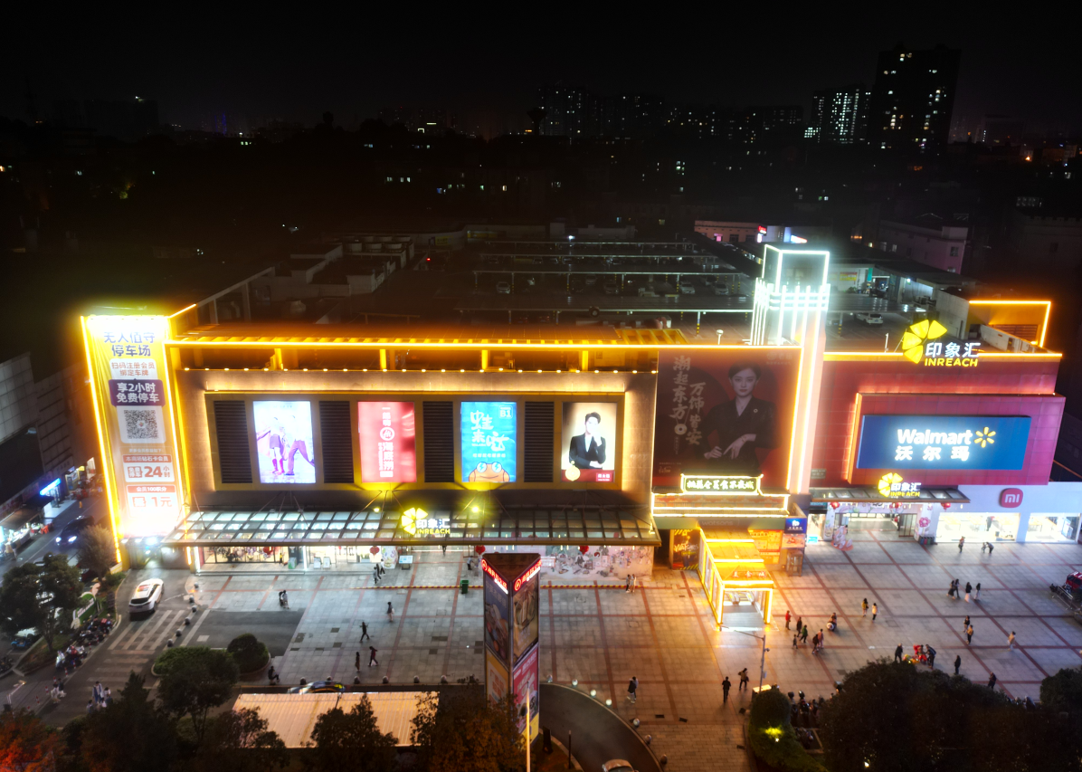 益陽印象匯坐落于赫山區(qū)桃花侖西路 555 號,作為印力集團(tuán)布局湘中的重要商業(yè)載體,這里匯聚了沃爾瑪、海底撈、茶顏悅色等數(shù)十家知名品牌,既是赫山區(qū)商超人氣榜的榜首???,也是承載市民日常消費(fèi)與社交休閑的核心空間。然而,隨著城市夜景美學(xué)的升級與夜間經(jīng)濟(jì)的發(fā)展,原有外墻燈光逐漸顯現(xiàn)出亮度不均、風(fēng)格單一、能耗偏高的問題,與商圈日益增長的品質(zhì)需求形成反差。