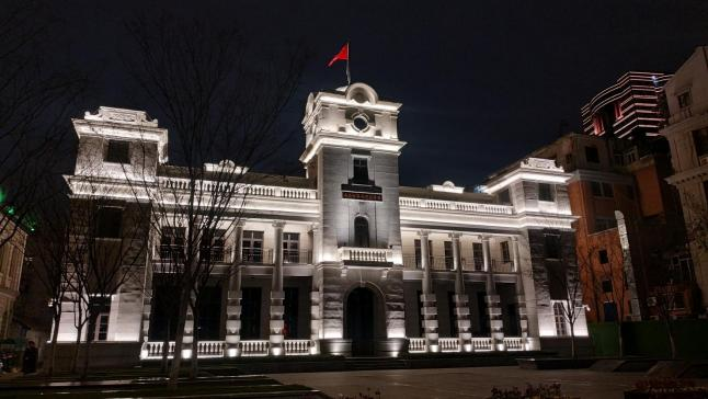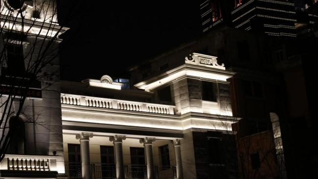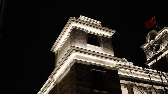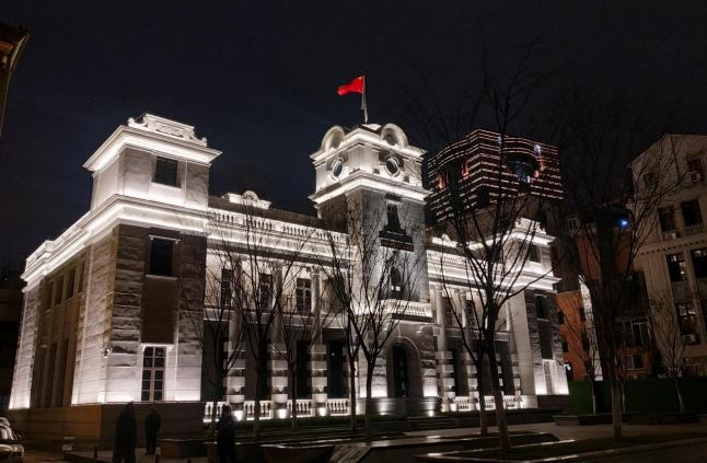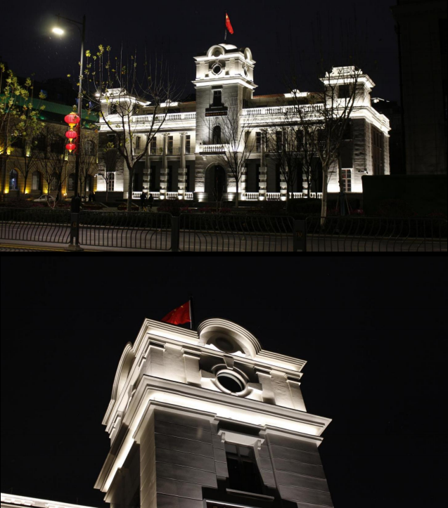 根據(jù)建筑自身特點(diǎn),燈光布局明暗有序,層次分明,整體采用大面積泛光照明的手法,局部細(xì)節(jié)采用重點(diǎn)照明的手法,突出建筑細(xì)部節(jié)點(diǎn)構(gòu)造,體現(xiàn)建筑獨(dú)特的美感。光影由下至上,層次豐富。樓頂?shù)奈逍羌t旗高高飄揚(yáng),在夜間燈光的輔助下,形成視覺焦點(diǎn),光彩奪目,莊重神圣。
